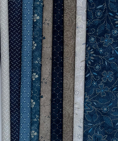 Inspired by the Dresdens on the Block design, the runner highlights beautifully pieced Dresden plates surrounded by coordinating patchwork sections. Each Dresden bloom is formed from the various blue prints, giving the design depth and movement while keeping the overall look cohesive.
