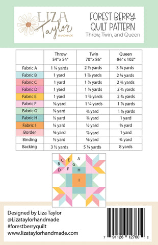 he Forest Berry Quilt by Liza Taylor of Liza Taylor Handmade is an ode to the classic basket quilt block, reimagined with a fresh, modern twist! The traditional basket shape is adorned with blooming flowers, adding a sense of movement and whimsy. Set alongside a playful star block, the design creates a charming balance of structure and softness. Whether you're drawn to classic quilting motifs or love a contemporary touch, this pattern brings a timeless yet lively feel to any project.